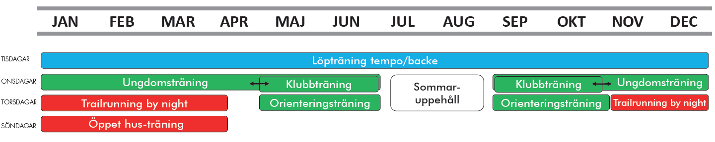 Under större delen av året har vi orienteringsträningar på onsdagar. TRäningen är til för alla, både för ungdomar och vuxna, nybörjare och rutinerade. Vi samlas på olika platser runt Karlshamn, men återkommer ofta till vår klubbstuga i Väggaparken. För ungdomverksamhet kan det vara orienteringsträningar, strapatser eller andra utmaningar. Orientering går att börja med i tidig ålder och kan utövas på många spännande sätt. Under sommar-halvåret är ungdomsträningen en del av Klubbträningen. Under sammanlagt sex onsdagar på våren och hösten är det Ungdomsserien – en träningstävling i Västra Blekinge där det också finns också Öppna banor för vuxna.